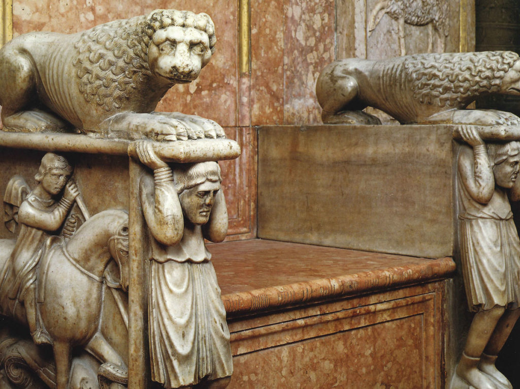 Da un punto di vista simbolico la cattedra episcopale è il simbolo della presidenza del Vescovo in occasione delle assemblee liturgiche all’interno della Cattedrale, che proprio da questo seggio prende il suo nome. I braccioli sono simmetrici e sono composti da due figure umane che, schiacciate da due leoni, incarnano l’allegoria della vittoria del Cristo sulla morte. Ai lati sono rappresentati altri episodi, come la battaglia tra San Giorgio e il drago e la conversione di Paolo.