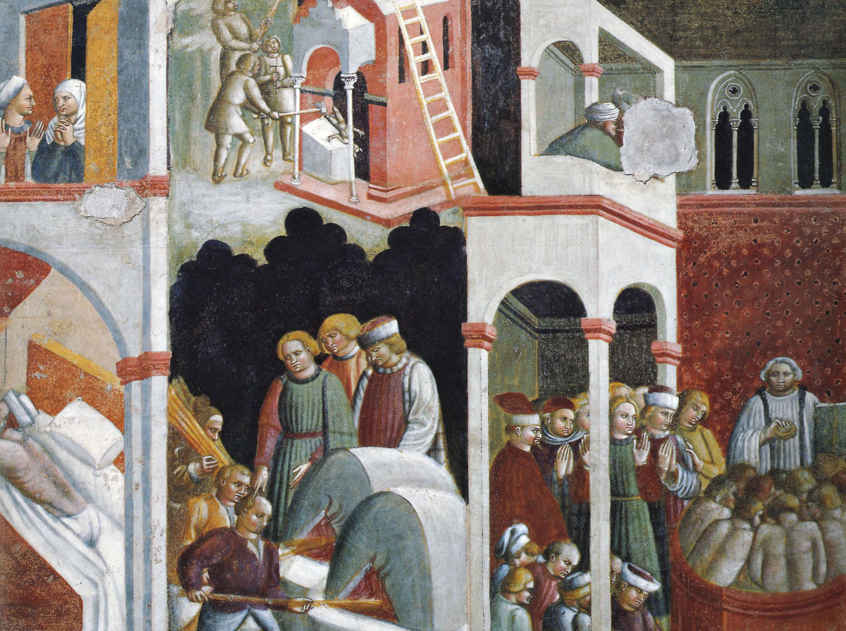 La scelta di dedicare la cappella alla storia di San Sebastiano è dovuta appunto al fatto che questo santo fosse invocato contro la morte improvvisa causata dall’epidemia. Gli affreschi si distinguono per il ritmo lento del racconto, per la particolarità della gestualità dei personaggi e per uno stile pittorico più leggero rispetto a quello della Cappella Valeri.