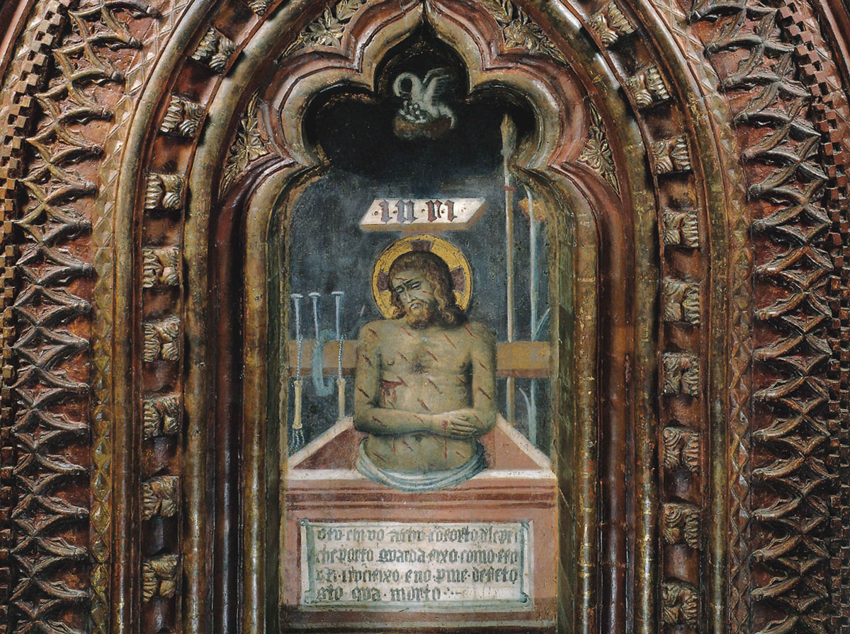 Al centro della rappresentazione è il Cristo, che mostrando ancora i segni del proprio sacrificio, ascende al cielo tra un tripudio di angeli e santi. La scena è dominata da un’intensa luce celeste e vede raccolti in un’unica composizione i simboli della passione, accompagnando il fedele in un cammino spirituale che procede dalla sofferenza terrena alla gloria divina.