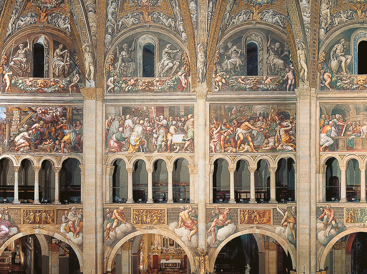 Affrescato da Gerolamo Mazzola Bedoli, questo affresco restituisce in immagini l’intensità del mistero eucaristico e domina dall’abside l’intera cattedrale.